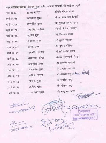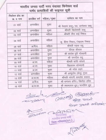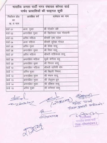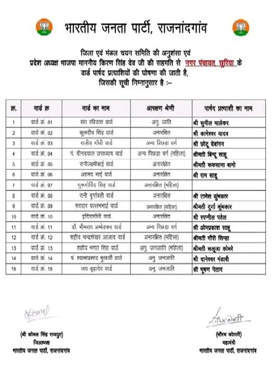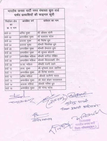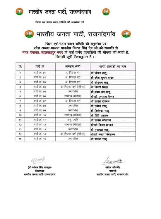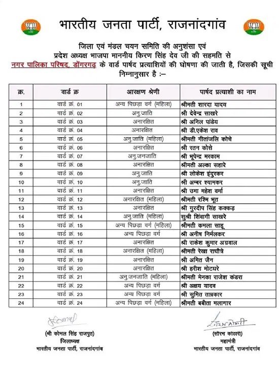 इधर राजनांदगांव जिले की सूची में पार्टी ने डोंगरगढ़ नगर पालिका परिषद के 15 वार्ड के साथ नगर पंचायत और लाल बहादुर नगर के 15-15 वार्ड के पार्षद प्रत्याशियों की सूची जारी कर दी है।