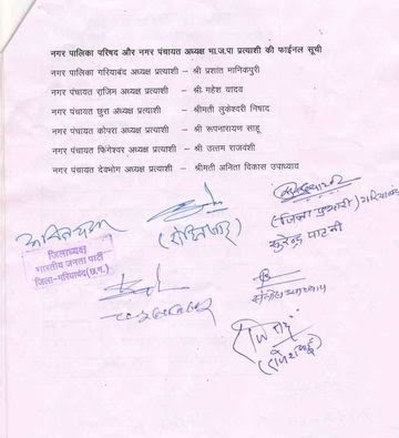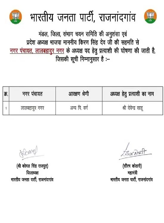 पार्टी ने छुरिया नगर पंचायत अध्यक्ष के लिए अजय पटेल को प्रत्याशी घोषित किया है। लाल बहादुर नगर पंचायत के लिए देवेंद्र साहू को अध्यक्ष पद के लिए प्रत्याशी घोषित किया है।