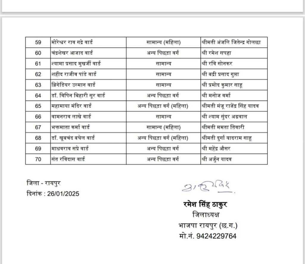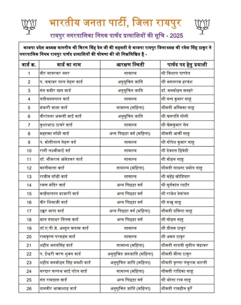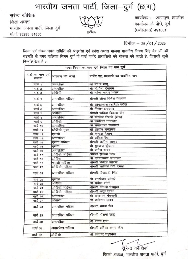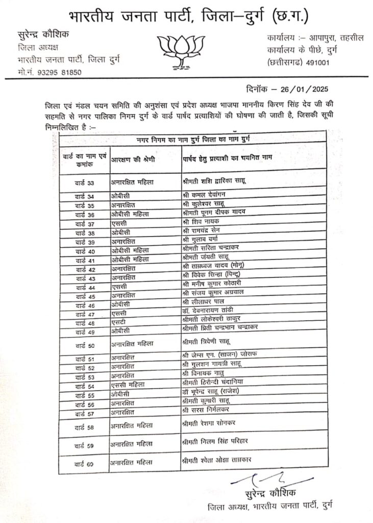 रायपुर/दुर्ग। भाजपा ने रविवार को छत्तीसगढ़ में नगरीय निकाय चुनाव के लिए प्रत्याशियों के नाम का ऐलान का सिलसिला जारी रखा इस बीच दुर्ग और रायपुर में भी सभी वार्डों के के प्रत्याशियों का ऐलान किया गया। दुर्ग जिला भाजपा ने सभी साथ बार्डों में पार्षद के प्रत्याशियों की घोषणा कर दी है। विरोध करते हुए सभी दुर्ग शहर के विधायक गजेंद्र यादव के यहां पहुंच गए।
