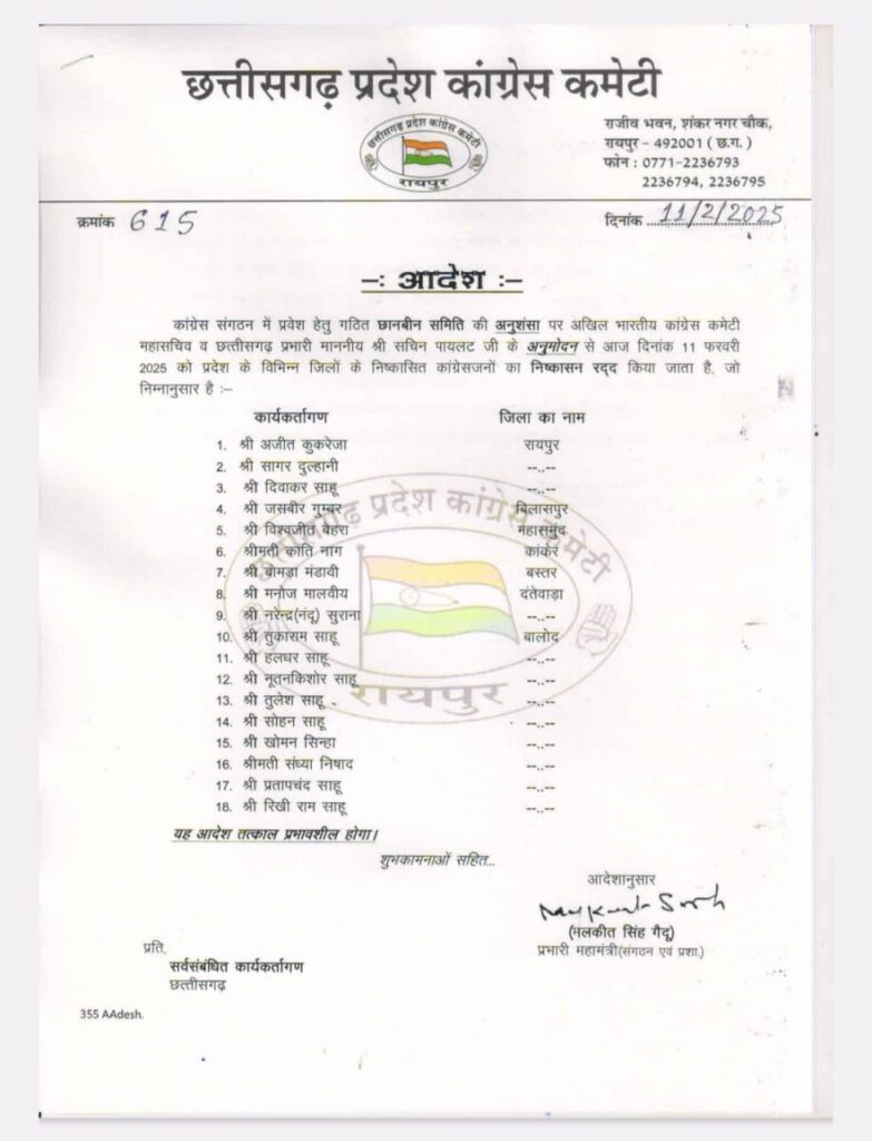 इन नेताओं को पार्टी में वापस शामिल करने की अनुशंसा कांग्रेस द्वारा गठित छानबीन समिति ने की थी। समिति की सिफारिश के बाद, अखिल भारतीय कांग्रेस कमेटी के महासचिव और छत्तीसगढ़ प्रभारी सचिन पायलट की अनुमति से यह फैसला लिया गया।वापसी करने वाले नेता अजीत कुकरेजा (रायपुर), शानू दुबे, दिवाकर साहू, जसबीर गुब्बर (बिलासपुर), विश्वजीत बोहरा (महासमुंद), काजल नाग (कांकेर), ब्रम्हदत्त मांडवी, मनोज मालवीय (दंतेवाड़ा), नरेंद्र (टंडन) सुरीन, जुगल साहू (बालोद), हिदायत अंसारी, मूलकिशोर साहू, तुलसी साहू, सोहन साहू, खालिद मिर्जा, संजय निषाद, प्रतापदेव साहू और रितेश साहू।