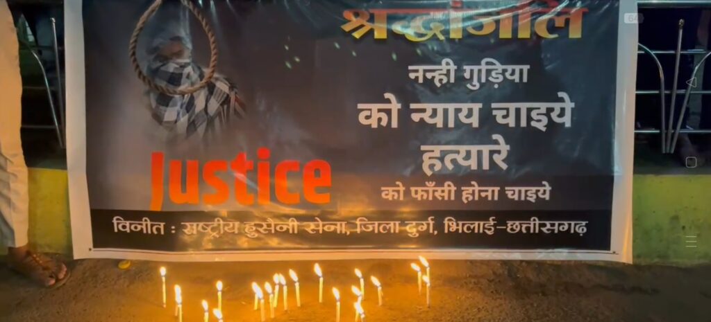 इस कड़ी में आज राष्ट्रीय हुसैनी सेना ने भी श्रद्धांजलि कार्यक्रम सुपेला घड़ी चौक में रखा था।इस कार्यक्रम में राष्ट्रीय हुसैनी सेना के बैनर तले सैकड़ों युवाओं के साथ हुसैनी सेना दुर्ग जिला अध्यक्ष सोहेल राईन के नेतृत्व में सुपेला घड़ी चौक में कैंडल मार्च करके सांकेतिक रूप से अपना विरोध दर्ज कराया और शासन प्रशासन की आंखें खोलने की कोशिश की और नशा को तत्काल रूप से बंद करने की पुलिस प्रशासन से आग्रह किया गया।