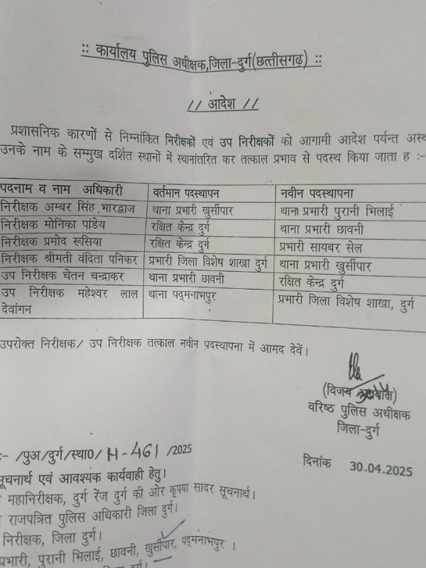 आज थानों प्रभारियों का ट्रांसफर भी कर दिया है।।एसएसपी विजय अग्रवाल ने 1 थाना प्रभारी को लाइन अटैच किया है, तो वहीं 6 को नई जिम्मेदारी दी है।