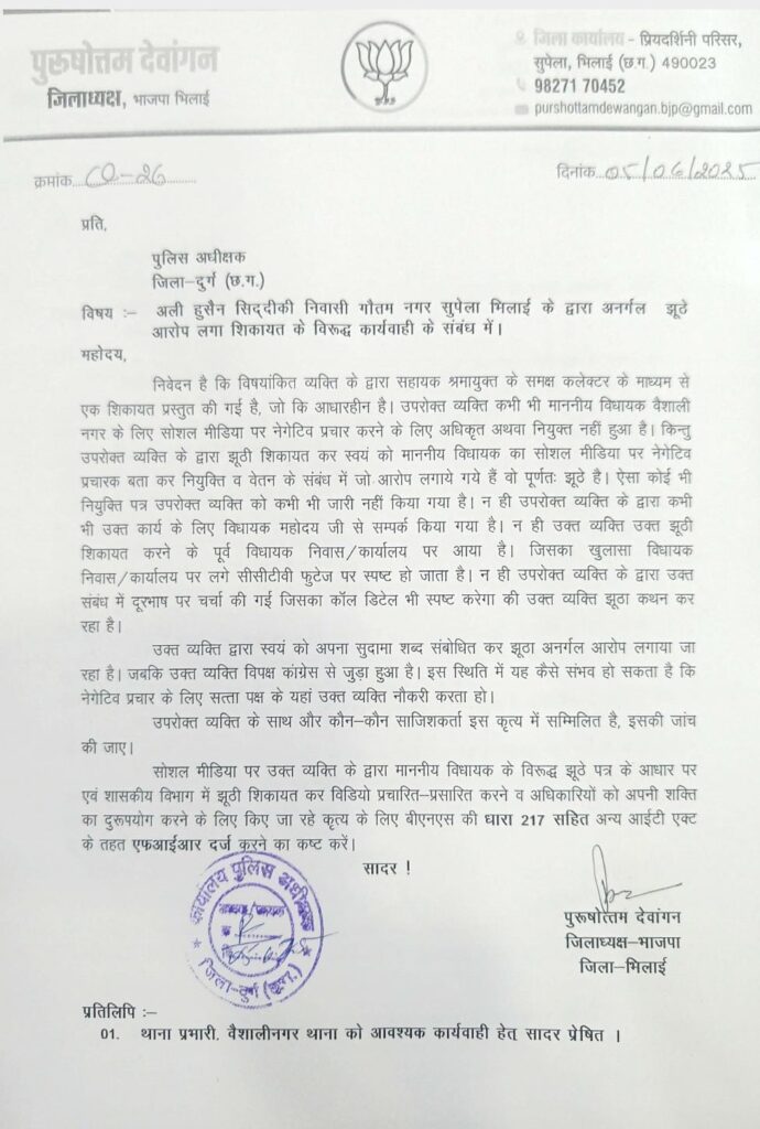 इधर भाजपा के भिलाई जिलाध्यक्ष पुरषोत्तम देवांगन ने एसएसपी से मुलाकात कर अली हुसैन सिद्दकी के खिलाफ शिकायत की है।