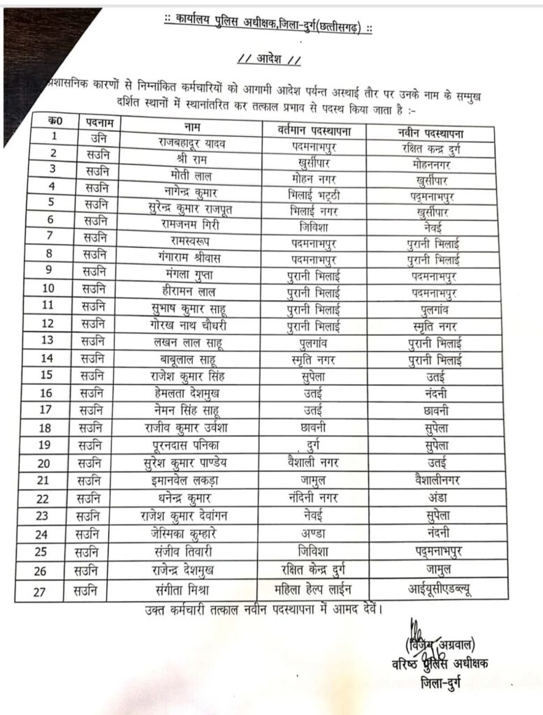 दुर्ग पुलिस विभाग में एक साथ 119 पुलिसकर्मियों का तबादला, SSP विजय अग्रवाल ने एक महीने में लगातार तीसरी बड़ी ट्रांसफर लिस्ट जारी की
