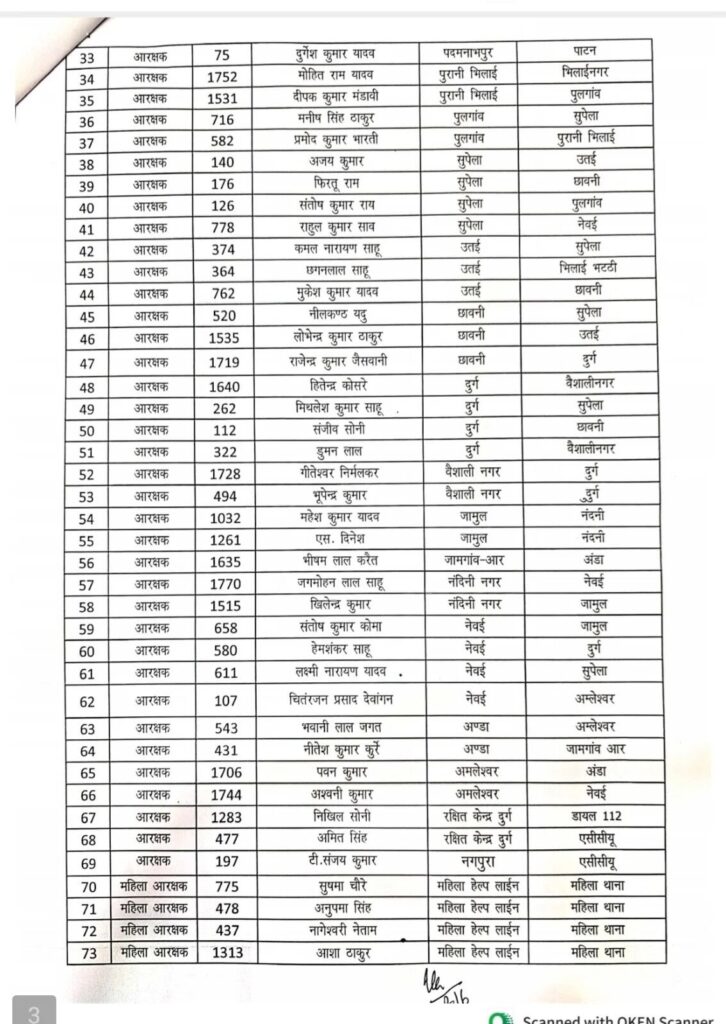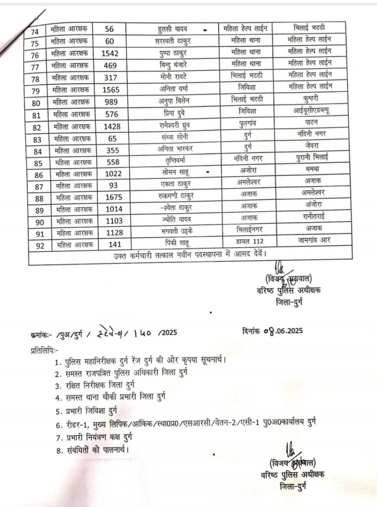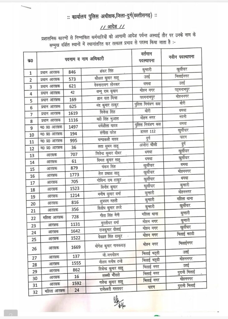 One thought on “दुर्ग पुलिस विभाग में एक साथ 119 पुलिसकर्मियों का तबादला, SSP विजय अग्रवाल ने एक महीने में लगातार तीसरी बड़ी ट्रांसफर लिस्ट जारी की