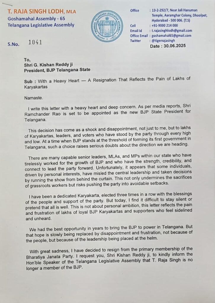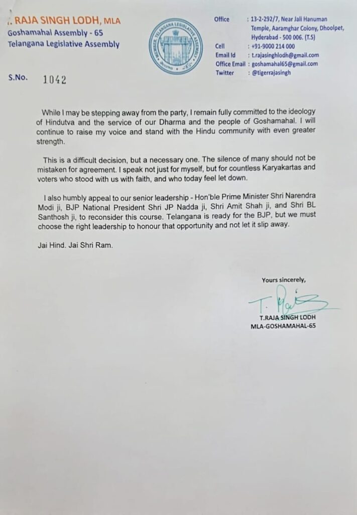 टी राजा सिंह ने पत्र में आगे लिखा, ‘यह एक कठिन निर्णय है, लेकिन एक जरूरी निर्णय है। बहुत से लोगों की चुप्पी को सहमति नहीं समझना चाहिए। मैं सिर्फ अपने लिए नहीं, बल्कि उन असंख्य कार्यकर्ताओं और मतदाताओं के लिए बोल रहा हूं जो हमारे साथ आस्था के साथ खड़े थे और जो आज निराश महसूस कर रहे हैं।’