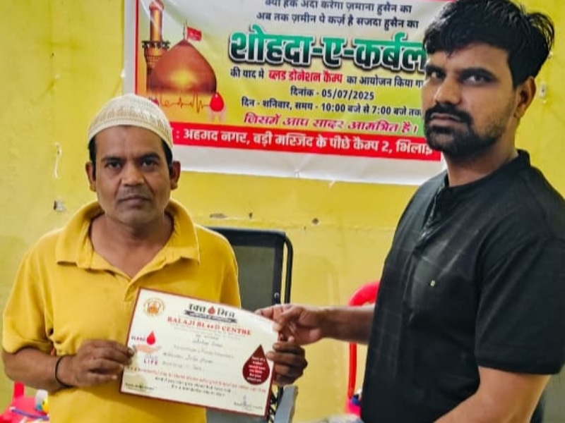 भिलाई। भिलाई में शोहदा__ए__कर्बला की याद में अहमद नगर कैंप 2 में S.K.C. अहमद नगर कमेटी के द्वारा हर साल की तरह इस साल भी मोहर्रम के उपलक्ष्य में एक दिन का रक्त दान शिविर लगाया गया जिसमें 113 नौजवानों ने बढ़ चढ़ कर हिस्सा लिया।