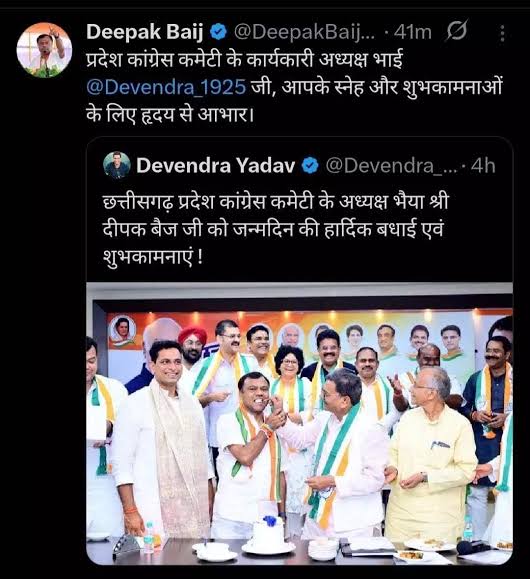 दरअसल, प्रदेश कांग्रेस अध्यक्ष दीपक बैज का 14 जुलाई को जन्मदिन था। इस दौरान दीपक बैज को देवेंद्र यादव ने सोशल मीडिया एक्स पर जन्मदिन की शुभकामनाएं दी। उन्होंने लिखा कि छत्तीसगढ़ प्रदेश कांग्रेस कमेटी के अध्यक्ष भैया दीपक बैज को जन्मदिन की हार्दिक बधाई और शुभकामनाएं !इस पर दीपक बैज ने प्रदेश कांग्रेस कमेटी के कार्यकारी अध्यक्ष भाई @Devendra_1925, आपके स्नेह और शुभकामनाओं के लिए हृदय से आभार लिख दिया। अब ये पोस्ट सोशल मीडिया पर वायरल हो गया। हालांकि कुछ घंटों के बाद पोस्ट को डिलीट कर दिया गया।