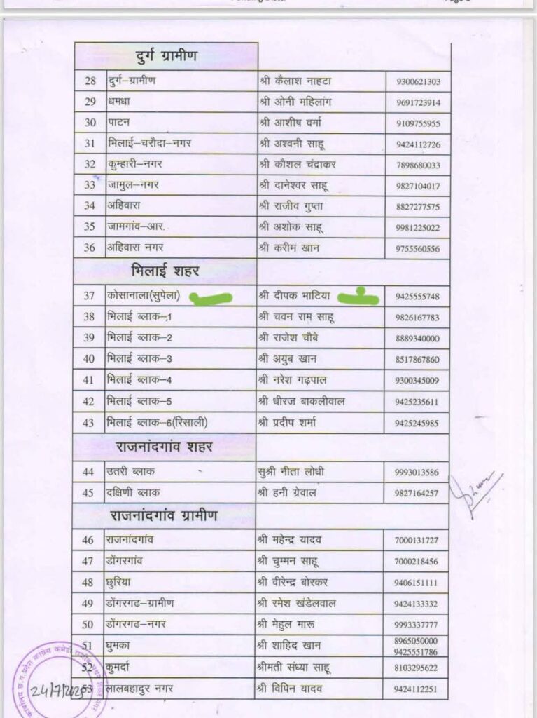 भिलाई शहर जिला कांग्रेस कमेटी के अंतर्गत कोसा नाल सुपेला ब्लॉक कांग्रेस कमेटी का प्रभारी दीपक भाटिया, भिलाई ब्लॉक एक का चवन राम साहू, ब्लॉक दो कांग्रेस कमेटी का प्रभारी राजेश चौबे , ब्लॉक कांग्रेस कमेटी कमेटी तीन का प्रभारी अयूब खान, ब्लॉक कांग्रेस कमेटी 04 का प्रभारी नरेश गढपाल, ब्लॉक कांग्रेस कमेटी पांच का प्रभारी धीरज बाकलीवाल, ब्लॉक कांग्रेस 6 रिसाली का प्रभारी प्रदीप शर्मा को बनाया गया है।