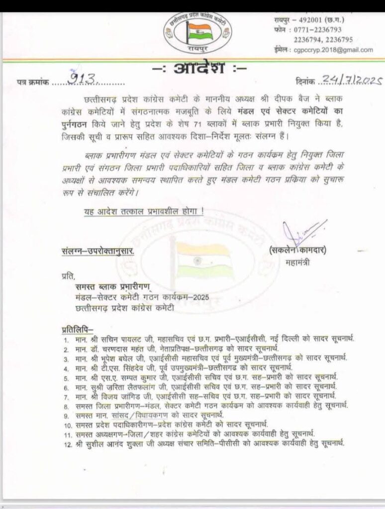 भिलाई नगर।छत्तीसगढ़ प्रदेश कांग्रेस कमेटी के अध्यक्ष दीपक बैज ने ब्लॉक कांग्रेस कमेटियों के प्रभारी की नियुक्ति संगठनात्मक मजबूती के लिए 71 ब्लॉक प्रभारी की नियुक्ति कर दी है। जिसमें भिलाई शहर जिला कांग्रेस कमेटी के अंतर्गत सात ब्लॉक कांग्रेस कमेटी में प्रभारी की नियक्ति की गई है कांग्रेस के जुझारू नेता दीपक भाटिया को कोसानाला सुपेला ब्लॉक कमेटी का प्रभारी नियुक्त किया गया है।