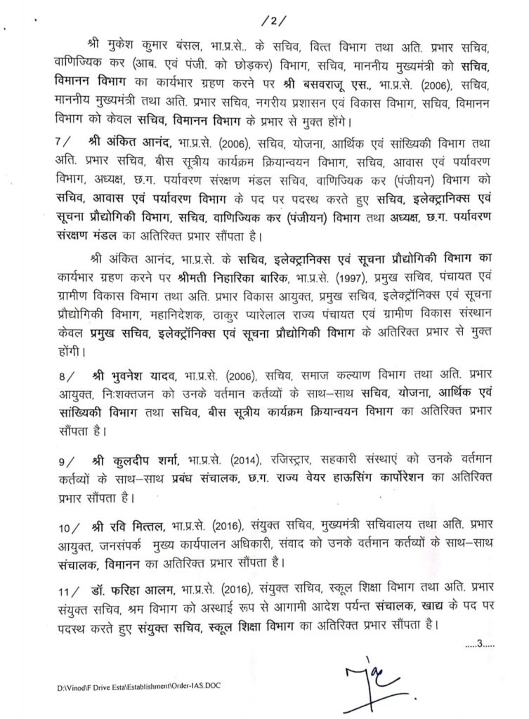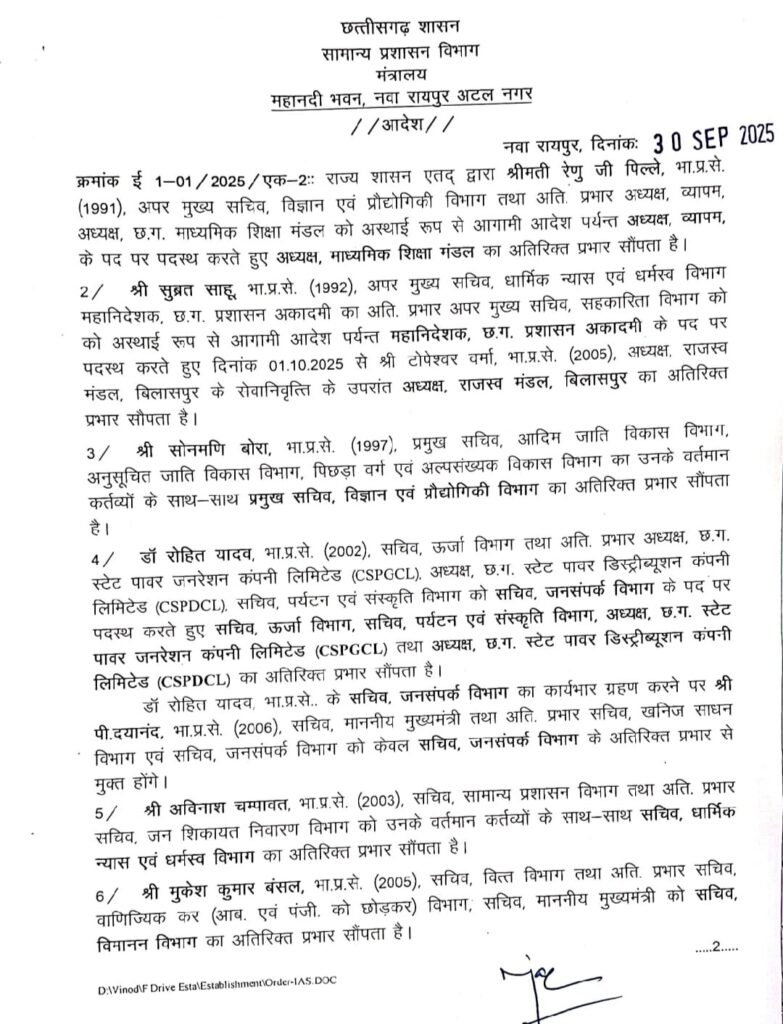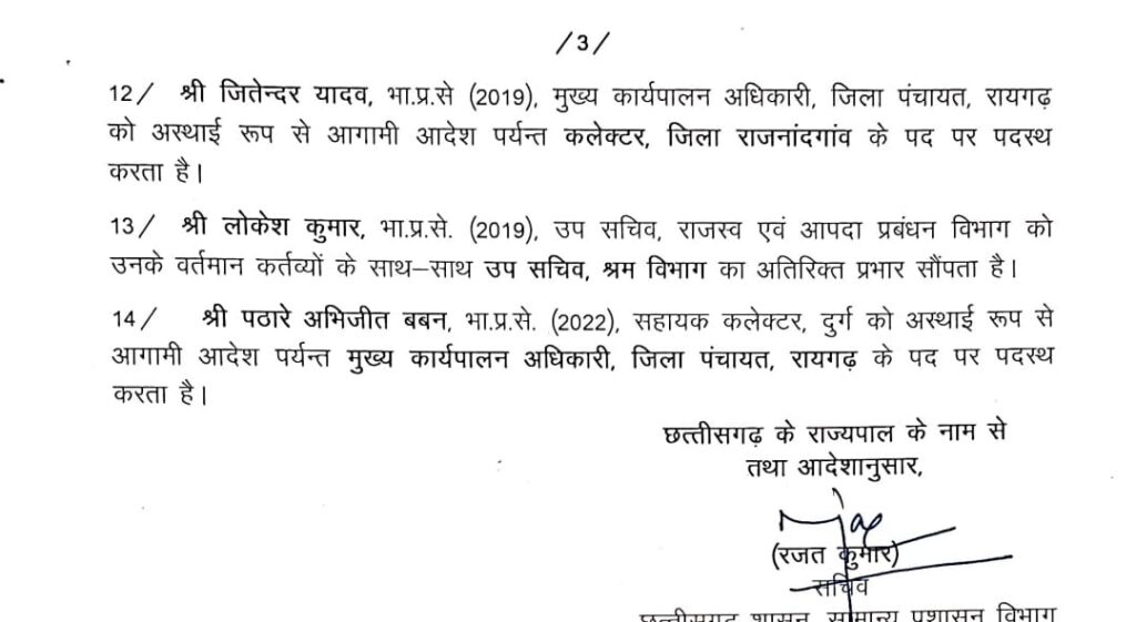 IAS 2019 बैंच जितेंद्र यादव राजनांदगांव जिले के नए कलेक्टर होंगे भारतीय प्रशासनिक सेवा के 14 अधिकारियों को आज इधर से उधर किया गया है IAS रेणु पिल्ले अध्यक्ष माध्यमिक शिक्षा मंडल, व IAS सुब्रत साहू अध्यक्ष राजस्व मंडल बिलासपुर बनाया गया है 2022 बैंच के पठारे अभिजीत बबन को सहायक कलेक्टर दुर्ग से मुख्य कार्यपालन अधिकारी जिला पंचायत रायगढ़ पदस्थ किया गया है