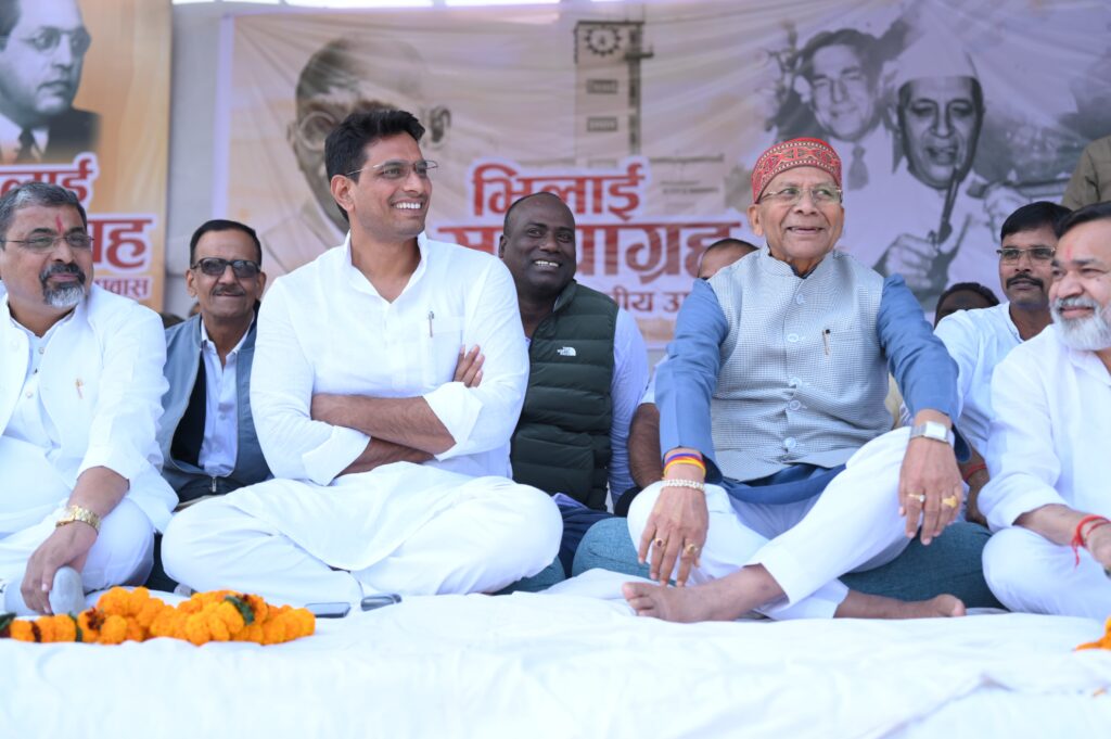 भिलाई।भिलाई सिविक सेंटर पार्किंग मैदान पर भिलाई नगर विधानसभा क्षेत्र के युवा विधायक देवेंद्र के द्वारा भिलाई सत्याग्रह के दूसरे दिन भी बीएसपी प्रबंधन एवं जिला प्रशासन का उदारता वाला चेहरा नहीं दिखने के कारण युवा विधायक श्री यादव ने एक दिन और 22 दिसंबर 2025 तक तीसरे दिन भी उपवास रहने की घोषणा आज सार्वजनिक रूप से कर दी, उनके साथ पार्षद लालचंद वर्मा एवं जग्गा राव भी उपवास में बैठे हुए है।