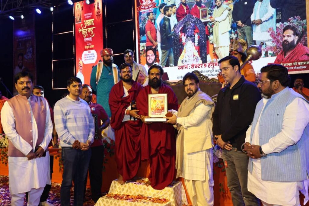 भिलाई। नववर्ष पर सेक्टर 9 हनुमान मंदिर, भिलाई में श्री मंगलमूर्ति धाम पीठ द्वारा आयोजित अखंड हिंदू राष्ट्र की स्थापना हेतु महंत कान्हा जी महाराज एवं देवा जी महाराज के श्रीमुख से विराट संगीतमय श्री हनुमंत आराधना में हैवी ट्रांसपोर्ट कम्पनी के डायरेक्टर एवं सर्व समाज कल्याण समिति के अध्यक्ष इंद्रजीत सिंह छोटू जी सम्मिलित हुए।