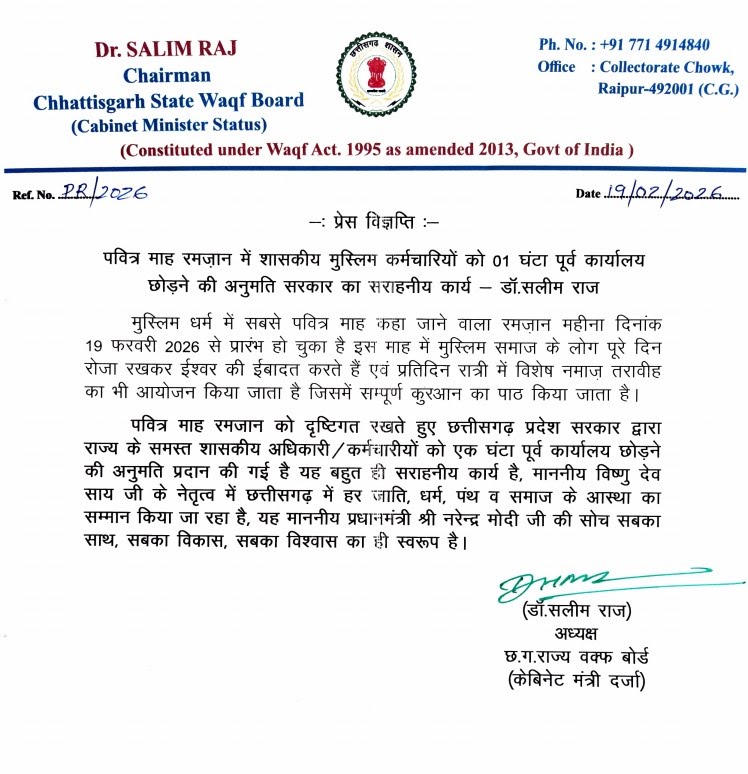 छत्तीसगढ़ राज्य वक्फ बोर्ड के अध्यक्ष डॉ. सलीम राज ने कहा-पवित्र माह रमजान को दृष्टिगत रखते हुए छत्तीसगढ़ प्रदेश सरकार द्वारा राज्य के समस्त शासकीय अधिकारी/कर्मचारीयों को एक घंटा पूर्व कार्यालय छोड़ने की अनुमति प्रदान की गई है. यह बहुत ही सराहनीय कार्य है। माननीय विष्णु देव साय जी के नेतृत्व में छत्तीसगढ़ में हर जाति, धर्म, पंथ और समाज के आस्था का सम्मान किया जा रहा है। यह माननीय प्रधानमंत्री नरेंद्र मोदी जी की सोच सबका साथ, सबका विकास, सबका विश्वास का ही स्वरूप है।