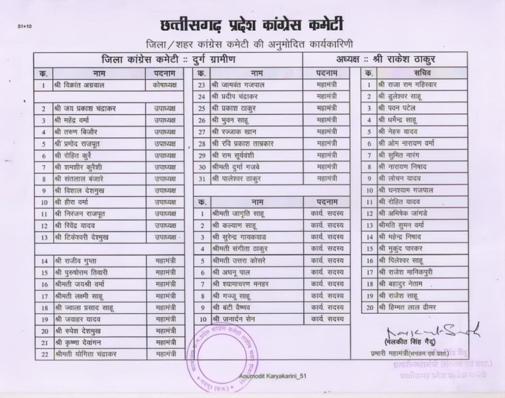 दुर्ग।दुर्ग ग्रामीण जिला कांग्रेस अध्यक्ष राकेश ठाकुर ने अपनी कार्यकारिणी की घोषणा कर दी है ।
